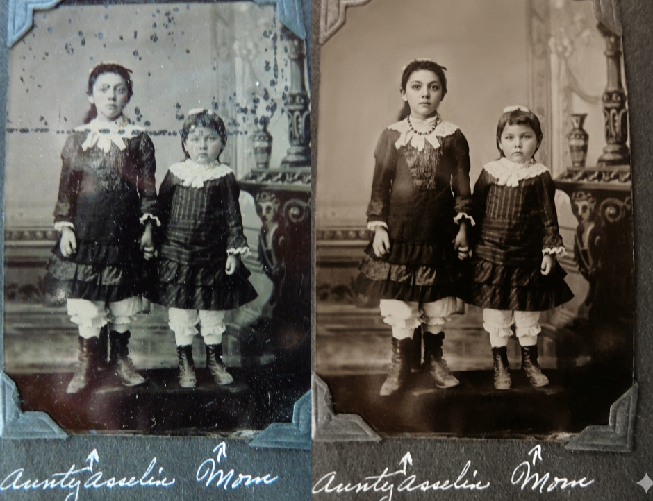 My great grandmother Claudia Caron (right) and her sister Anna (left) in both the original, distressed version and in an AI “restoration” of the photo.